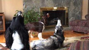 Английский спрингер-спаниель раздражает хаски, что приводит к большому количеству вой. Небо (Хаски), Маршалл (черный/белый Спрингер), и Сэди (Браун/tri Спрингер) выполняя то, что я думаю, вы могли бы назвать своего рода трио.