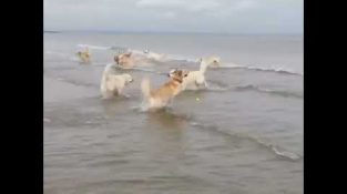 Направляя его внутренний кенгуру, Этот Золотой ретривер получил начала спектакля и взял массивные прыжков в прохладном, освежающий океан с его собачка друзей.