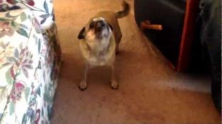 Меган, Собака породы мопс, оказывается странный воющий при попытке расшивы.