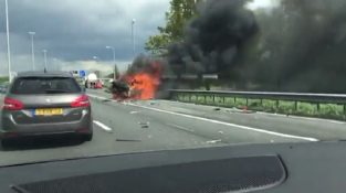 Автомагистраль A2, в Амстердаме, Нидерланды, горящий автомобиль взрывается зафиксированный водителем камеры.