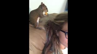 Белка прячет свою пищу на волосы женщины