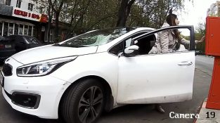 Женщина приходит на стоянке, и пытается получить карту из слота-автомата. Но не достаточно, и вынужден выйти из машины, но забыв натянуть ручной тормоз.