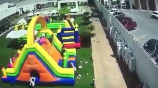 Сильный ветер перетащить надувной замок, в котором играли дети