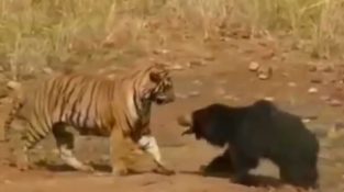 В Индии Tantompa Национальный парк, молодые драки медведя против тигра-самца хотели бросить вызов медведя из области. Оба животных выжили с некоторыми травмами.