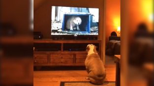 Calista Бульдог всегда бегут к телевизору как раз показывая ее любимое объявление.