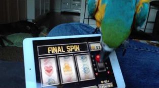 Наш попугай, Китти, играет Заключительный спин Jetpack Joyride. Она любит красный цвет, поэтому, когда она увидела, что я играл, она хотела получить в акции.