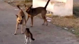 Кошка подвергается нападению нескольких собак. но отважный кот стоять в одиночку бороться и побеждать..