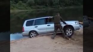 В России, двое мужчин пытаются слезть автомобиль от берега реки. Удастся ли они;