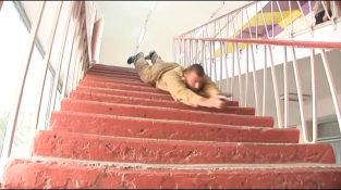 В боевых искусств академии Кадочников в Краснодаре, Воспитанники русского боевого искусства «Система» выполняют странное упражнение «спуск» с лестницы.