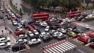 Что происходит, когда все водители одновременно пытаясь пересечь перекресток. Случай был зарегистрирован в центре Скопье.