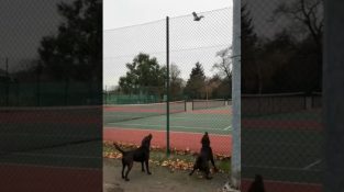 В парке Баттерси в Лондоне, белка, лежа на верхней части забора избежать удара двух собак делает большой скачок.