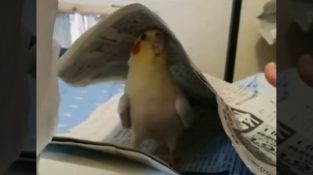 Попугай скрыт под газетой, и играть в прятки (игра в прятки) владелец.