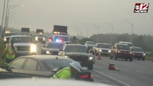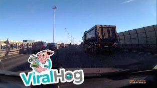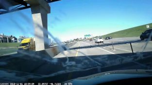 Сотрудник полиции сбила машина во время аварии на шоссе. Он занимает время, чтобы подтолкнуть человека, который с ним, чтобы защитить его.