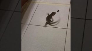 Ящерица, пытаясь поймать маленькое насекомое на плитках квартиры в Тайване. Но ее ноги скользят и не могут достигнуть насекомого, которое проходит перед.