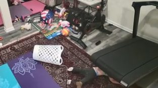 Беговая дорожка пытается съесть маленького мальчика. К счастью, мальчик убегает.