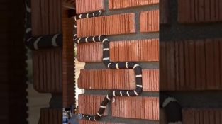 Змея движется в углублениях между кирпичами стены, напоминает игру 'змейка' из старых мобильных телефонов.