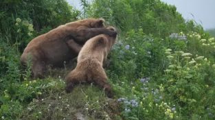 Бесстрашная мама-медведица защищает двух своих детенышей от нападения самца в Катмаи, Аляска.. Медведи-самцы нападают на детенышей – обычное дело, но это то, в чем исследователи [...]