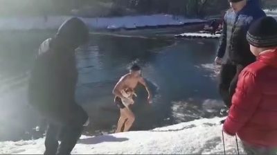 Muž v Simferopol Krym ponoriť sa do ľadového jazera zachrániť psa, ktorý nemôže dostať von z vody.