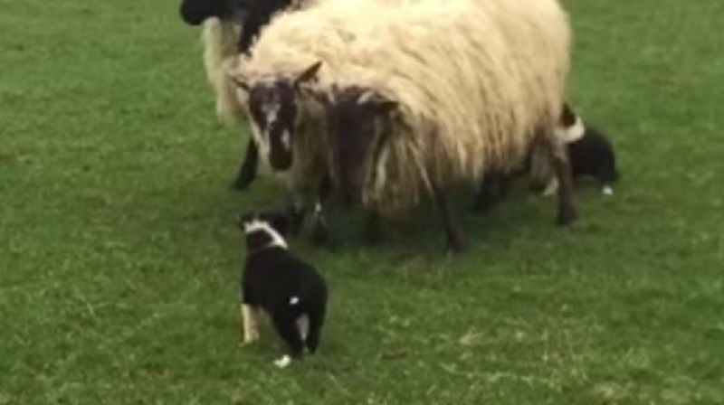 ciara, samica šteňa Brodeur Kolei 7 týždňov, Nie sú vystavené ovce na lúke prvýkrát. Sú piatej generácie rodiny ovčiaka, šteňa okamžite poháňané inštinktom a učí sa od jeho matky, bez zobrazenia žiadne známky strachu pred oviec, ktoré sú oveľa väčšie, než toto.