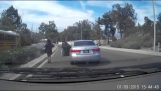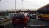Bohužiaľ pre vodiča, na ceste stenepse a na zadnej strane jeho auta bol zasiahnutý sklápacie vozík, odosielanie do protiidúce vozidlo.