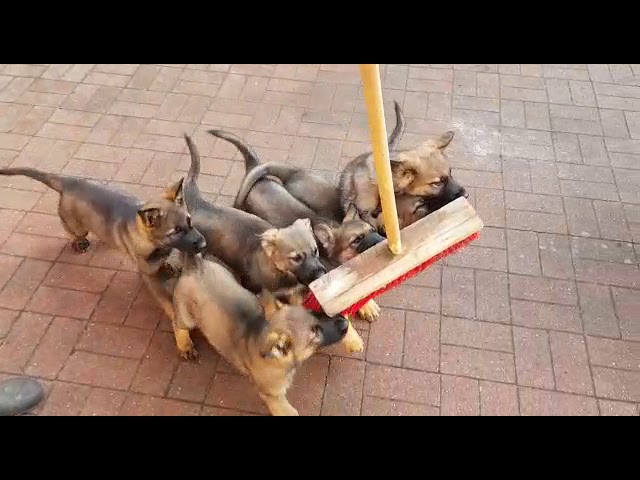 Nemecký ovčiak šteniatka našli novú hru, a napádať zúrivo na metle.