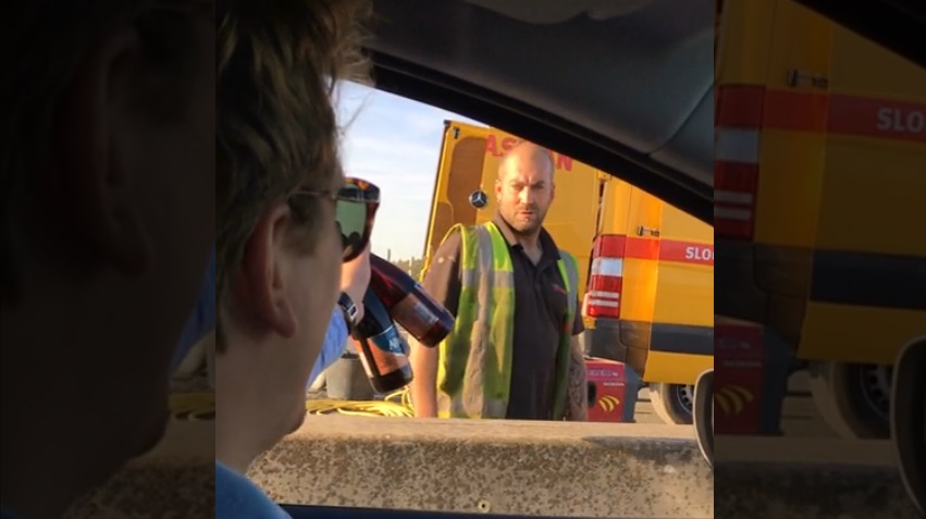 V Holandsku, sprievodca ponúka niekoľko studené pivo v skupine robotníkov, ktorí pracujú na ceste.