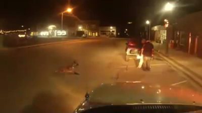 Policajný pes zachráni svojho kolegu, keď je podozrivý pokúša útočiť. strehu, Pes rúti s pôsobivou rýchlosť a zastavenie darebáka.