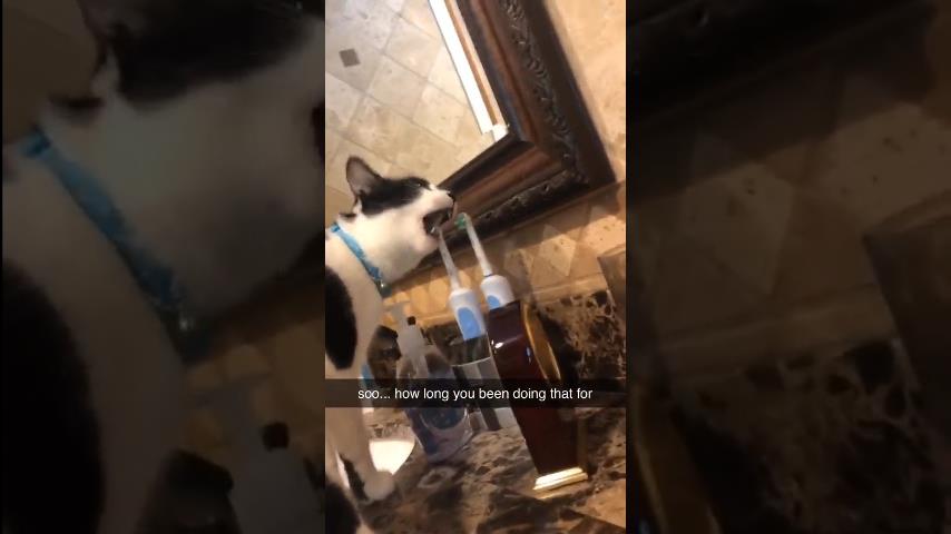 Majiteľ mačky nájde svojho domáceho maznáčika v kúpeľni, hryzavé zubné kefky. Nie je známe, ako dlho to robil…