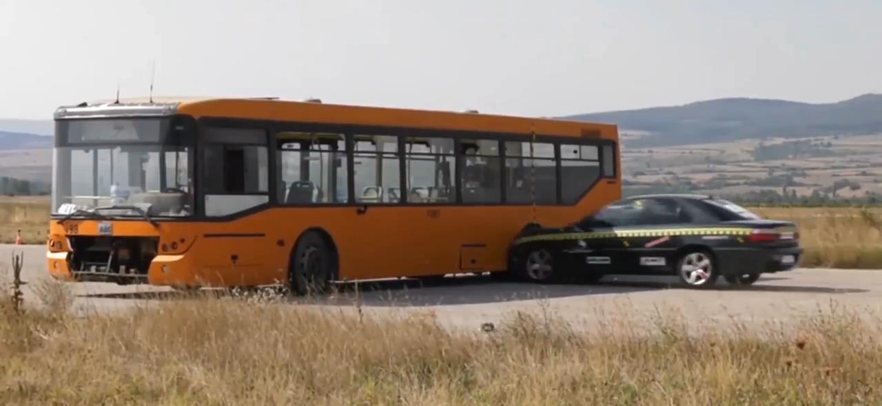 Výsledok zrážky osobného automobilu idúceho rýchlosťou 200 km / h, autobusom.