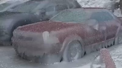 Nočný ľadový dážď a silný vietor v ruskom Vladivostoku, vytvoril v zaparkovaných autách hustú ľadovú kôru.