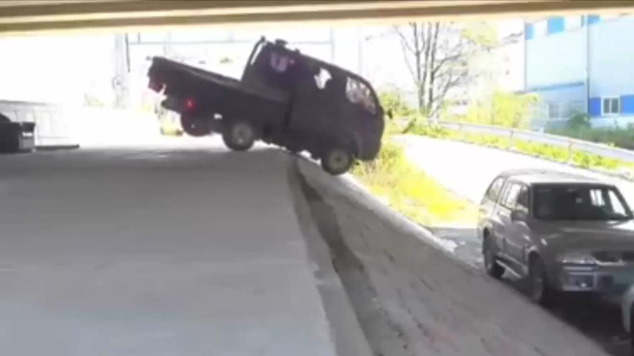 Vodič malého nákladného auta v Kórei, pokusy o zostup strmým zostupom.