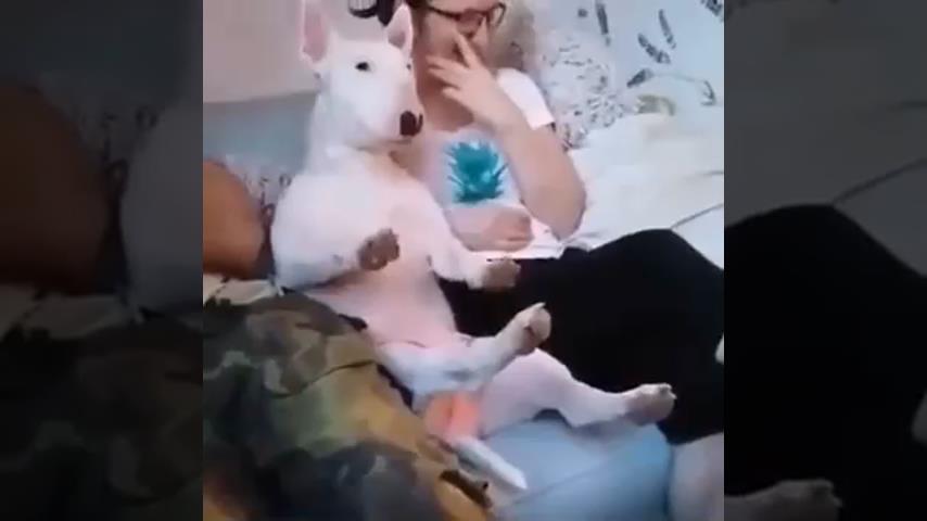Sedí na pohovke, pes pozerá televíziu so zvyškom rodiny.
