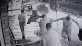 Nemecký ovčiak zaútočí na malého psa, Zatiaľ čo dvaja ďalší psi pretiahli svojho majiteľa do boja.