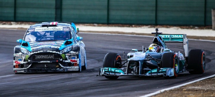 V zábavný zápas bez víťaz a porazený, ovládače Ken Block a Lewis Hamilton psychagwgisan divákov na festivale Top Gear na ostrove Barbados. Hamilton, kto je v hornej časti poradia F1, pretekal s AMG Mercedes F1 auto, Zatiaľ čo blok s Ford Fiesta.