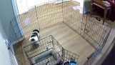 V klietke, dve lietajúce veveričky používajú koleso súčasne, každý inou technikou. Video bolo natočené pri jazere Ronkonkoma na Long Islande (Spojené štáty americké) licencovaným ošetrovateľom zoo zo štátu New York.
