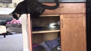 Mačka buchne skriňa dvere zavrel na chlapca, ktorý vyliezol vnútri.