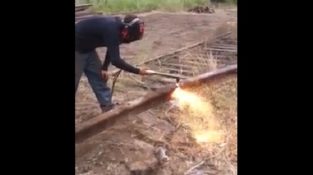 Pracovník sa pokúsi znížiť trati s rezací horák. Bohužiaľ, Stojí na zlej strane krivky a koľajnice by udrel ho do hlavy. Aoyts!
