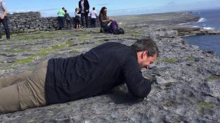 Muž s intenzívnym strachom z výšok, sa snaží vidieť výhľad na historickú pevnosť Dun Aonghasa v Aran Islands Írsku. Pevnosť sa nachádza vo výške 100 metrov nad morom.