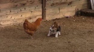 Korgki plemeno psa sa snaží hrať sliepke, čo nie je nijak zvlášť oceňuje hru.