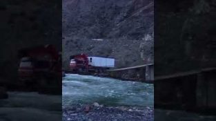Tento veľký kamión prevážal mobilných domov, keď narazil na malý drevený most. Po správnom obloženie seba samu, pomaly išiel cez bez toho, aby upadli do nižšie rieky.