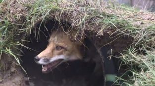 V US Floride, pet líška hrá so psom beží v záhrade. Fox miluje schovať v malom tuneli vytvorenej vlastníkmi.