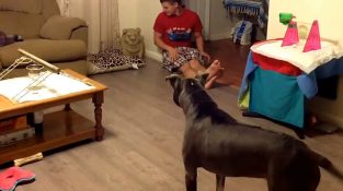 Domáce zviera líška a nemecký ovčiak hrať spolu