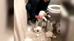 Mačka čistí stratu vyrobený na záchode sa hrá s papierom. S pomocou šéfa, chytí kúsky papiera s prednými nohami a stavia ich do koša.