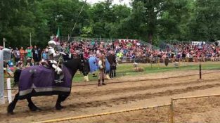 Jedným z mála ženských jousters na svete schytal neuveriteľne ťažké, keď išla proti mužským jouster pri Olde anglickej Faire. 23. júna, 2018 / Peoria, Illinois, Spojené štáty americké.