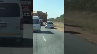 Car sa snaží predbehnúť kamión (Zimbabwe)