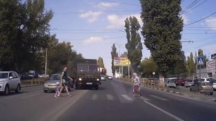 22. septembra, 2018 / Saratov, Rusko Kamión Kamaz narazil do tohto otca a dcéry na priechode pre chodcov neďaleko nákupného centra Astera na Prospect Stroiteley.