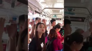 V preplnenom autobuse v meste Huai'an Číny, žena používa novú metódu k odpočinku, keď sú všetky úchyty sú objímali.