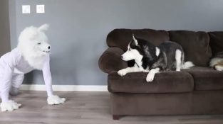 Zamaskované s vlčí kostýmu, človek sa snaží vydesiť oboch husky sedí na gauči.