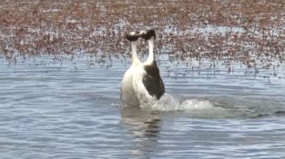 Fun párovanie Potápka chochlatá, druh vtáctva patrí do rodiny Podicipedidae, jazero v provincii Santa Cruz Argentína. Dvojica sa zdá byť niečo ako tancovať tango na vodnej hladine.