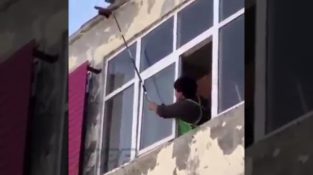 Človek sa snaží prelomiť hniezdo osy v blízkosti okna, pomocou klacku.